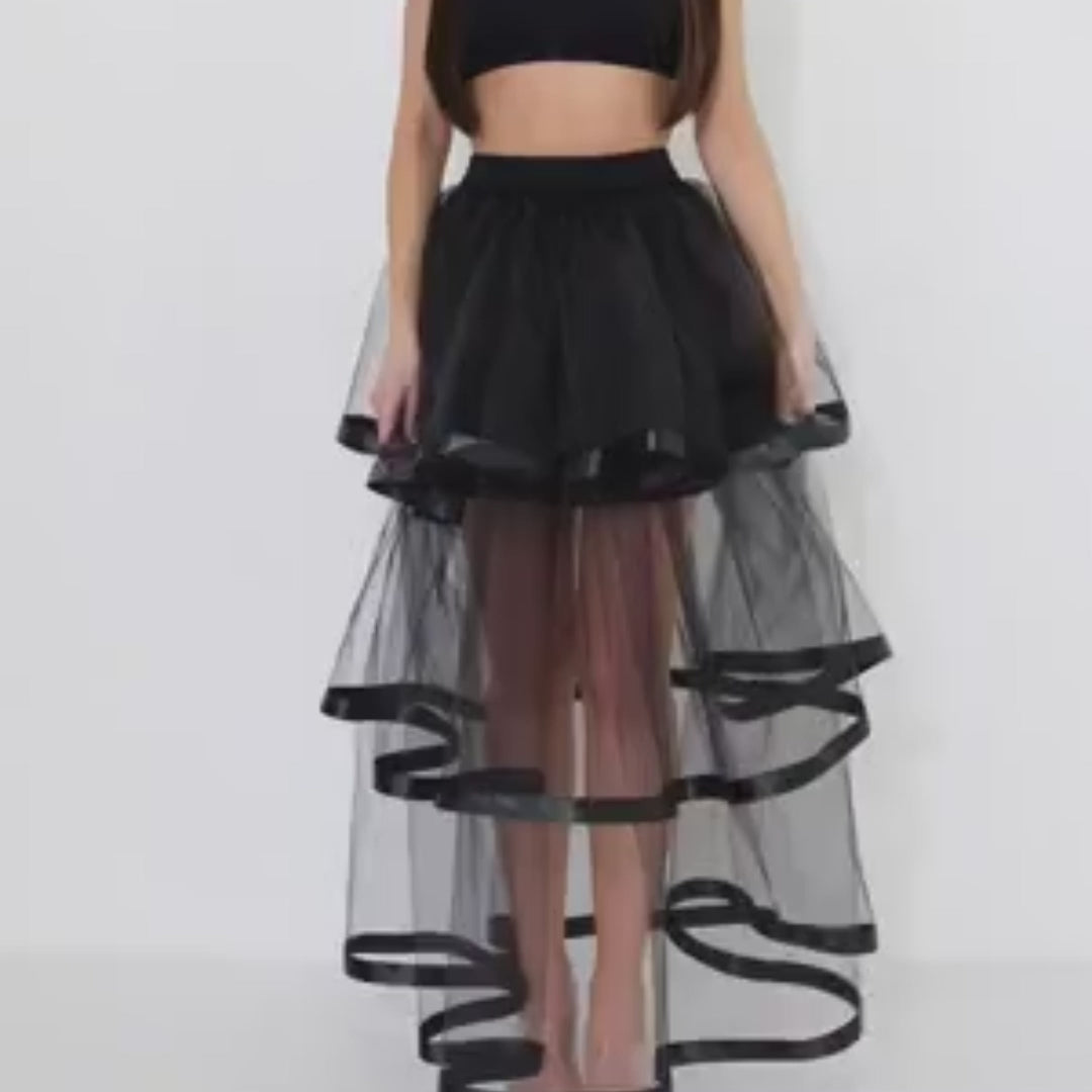 Materials: Tulle, satin. Elastic waistband. Multi-layered design.